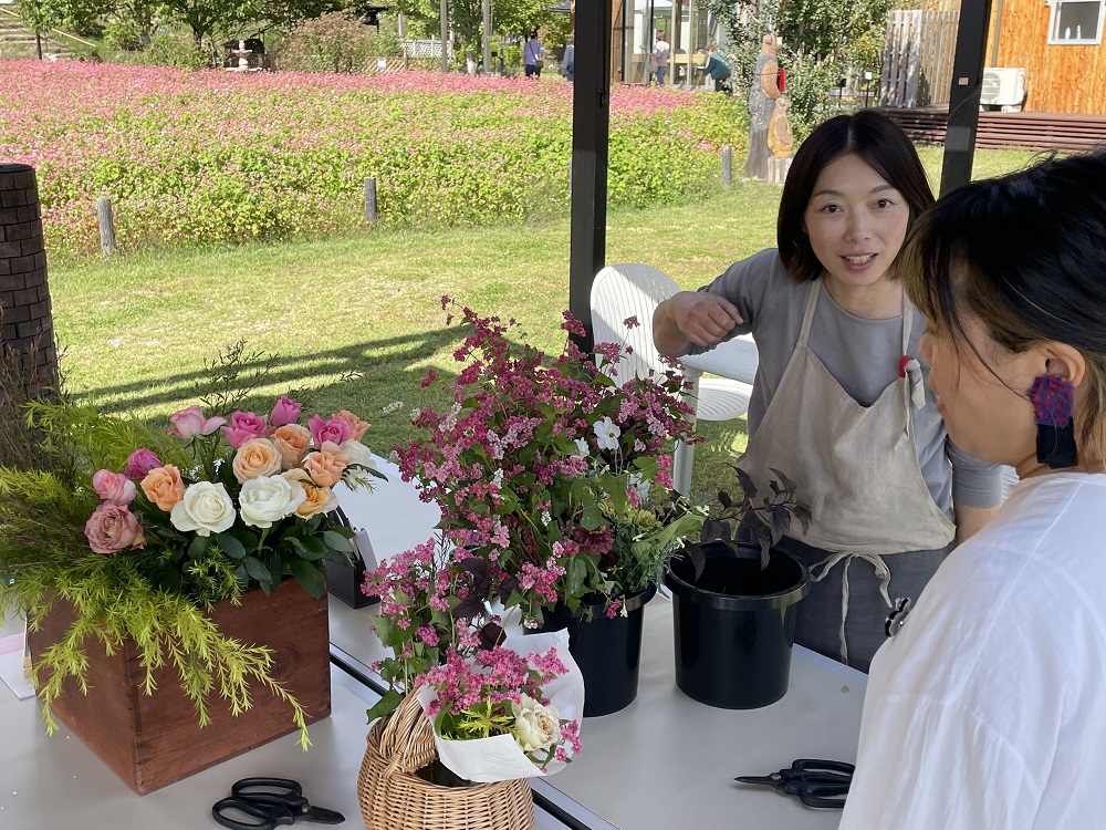 当日は、赤そばを使ったブーケ作りや
